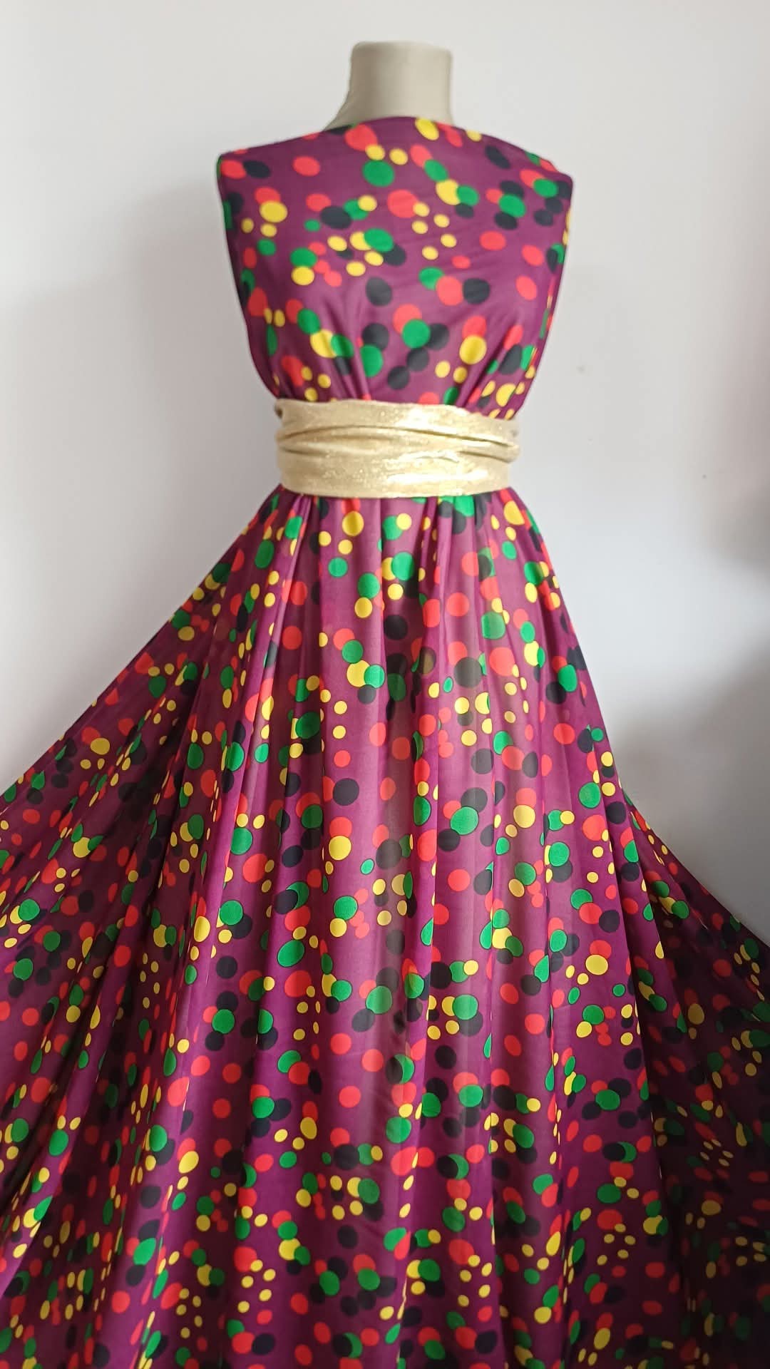 Un voal diafan cu textură fină și cădere fluidă, într-o nuanță profundă de plum, animată de buline colorate în tonuri vii de verde, roșu, negru și galben. Un imprimeu vesel și echilibrat care adaugă farmec și dinamism oricărei piese vestimentare sau decor.