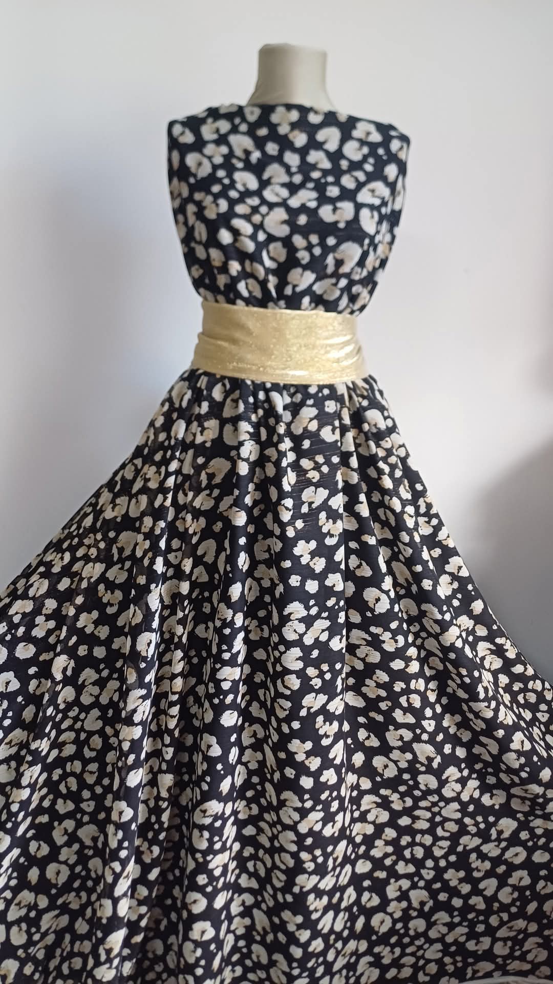 Un material spectaculos și rafinat, acest voal negru cu imprimeu animalier este pus în valoare de un fir subtil lame auriu care adaugă un strop de strălucire discretă. Perfect pentru rochii elegante, fuste fluide, bluze cu personalitate sau volane cu efect dramatic, este o alegere inspirată și pentru decorațiuni cu accente glam. Ușor, vaporos și sofisticat, acest voal oferă versatilitate și impact vizual în orice creație.