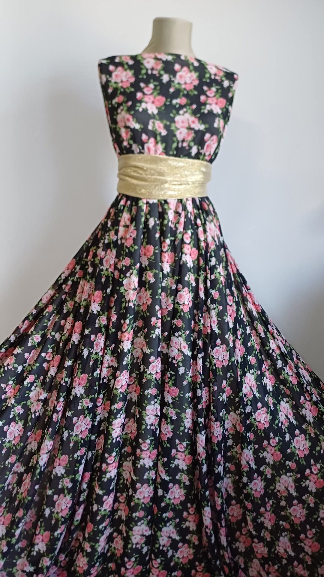Voal chiffon negru cu buchete delicate de trandafirași roz, un material elegant și rafinat, ideal pentru realizarea rochiilor vaporoase, fustelor fluide, bluzelor ușoare, eșarfelor fine sau a decorațiunilor cu un aer romantic și sofisticatTextura sa fină și căderea naturală oferă un plus de grație oricărei creații, evidențiind feminitatea și bunul gustCalitatea deosebită îl face ușor de lucrat și plăcut la purtare, fiind alegerea perfectă pentru proiectele tale vestimentare sau de design interior
