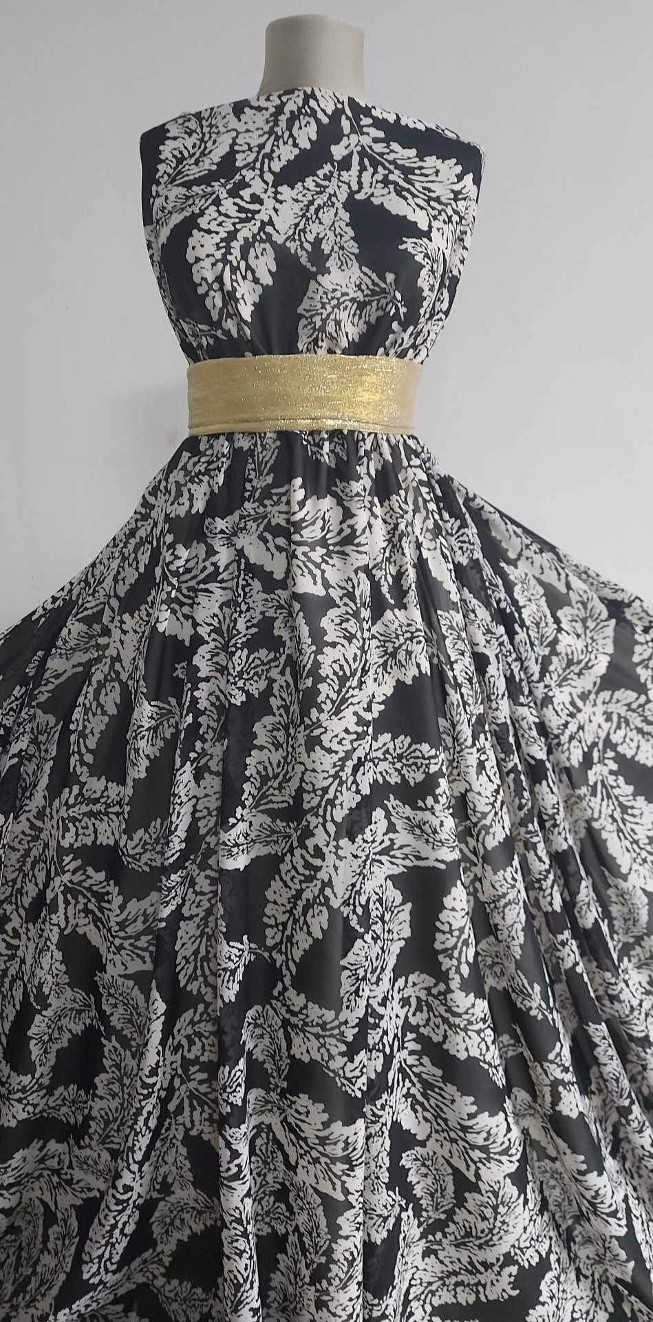Voalul de chifon negru cu ghirlande și frunze albe este o alegere elegantă și versatilă pentru diverse proiecte vestimentare și decor. Având o textură grea și curgătoare, acest voal este potrivit pentru confecționarea rochiilor, fustelor, bluzelor, eșarfelor și chiar pentru diverse decorațiuni. Designul cu ghirlande și frunze albe adaugă un element subtil și rafinat, oferind fiecărei piese un aer sofisticat și distins.